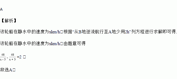 A、B两地相距48km,一艘轮船从A地顺流航行至B地,比从B地逆流航行至A地少用2h,已知水流速度为5km/h,求该轮船在静水中的航行速度是多少km/h?若设该轮船在静水中的速度为xkm/h,则可列方程( )