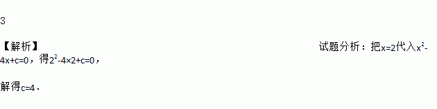 3 【解析】试题分析:把x=2代入x2-4x+c=0,得22-4×2+c=0, 解得c=4.