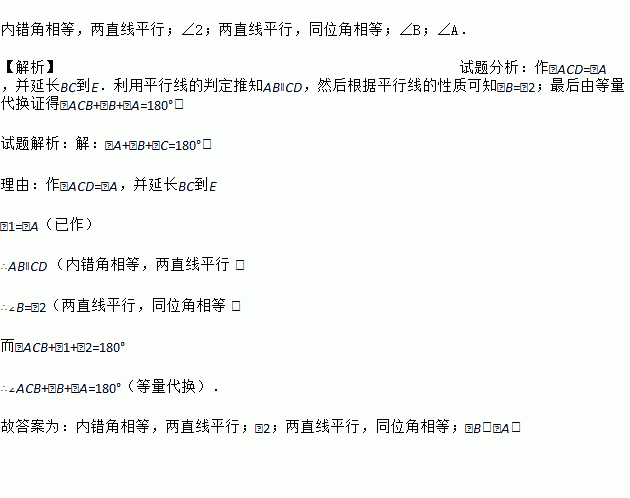 内错角相等,两直线平行;∠2;两直线平行,同位角相等;∠B;∠A. 【解析】试题分析:作∠ACD=∠A,并延长BC到E.利用平行线的判定推知AB∥CD,然后根据平行线的性质可知∠B=∠2;最后由等量代换证得∠ACB+∠B+∠A=180°. 试题解析:【解析】 ∠A+∠B+∠C=180°. 理由:作∠ACD=∠A,并延长BC到E ∠1=∠A(已作) ∴AB∥CD (内...