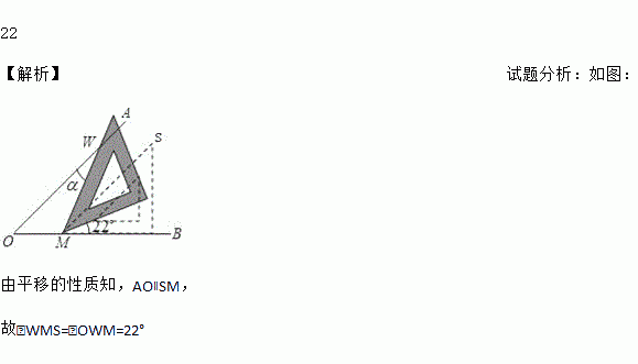 用等腰直角三角板画∠AOB=45°,将三角板沿OB方向平移到如图所示的虚线M处后绕点M逆时针旋转22°,则三角板的斜边与射线OA的夹角α为_____度.