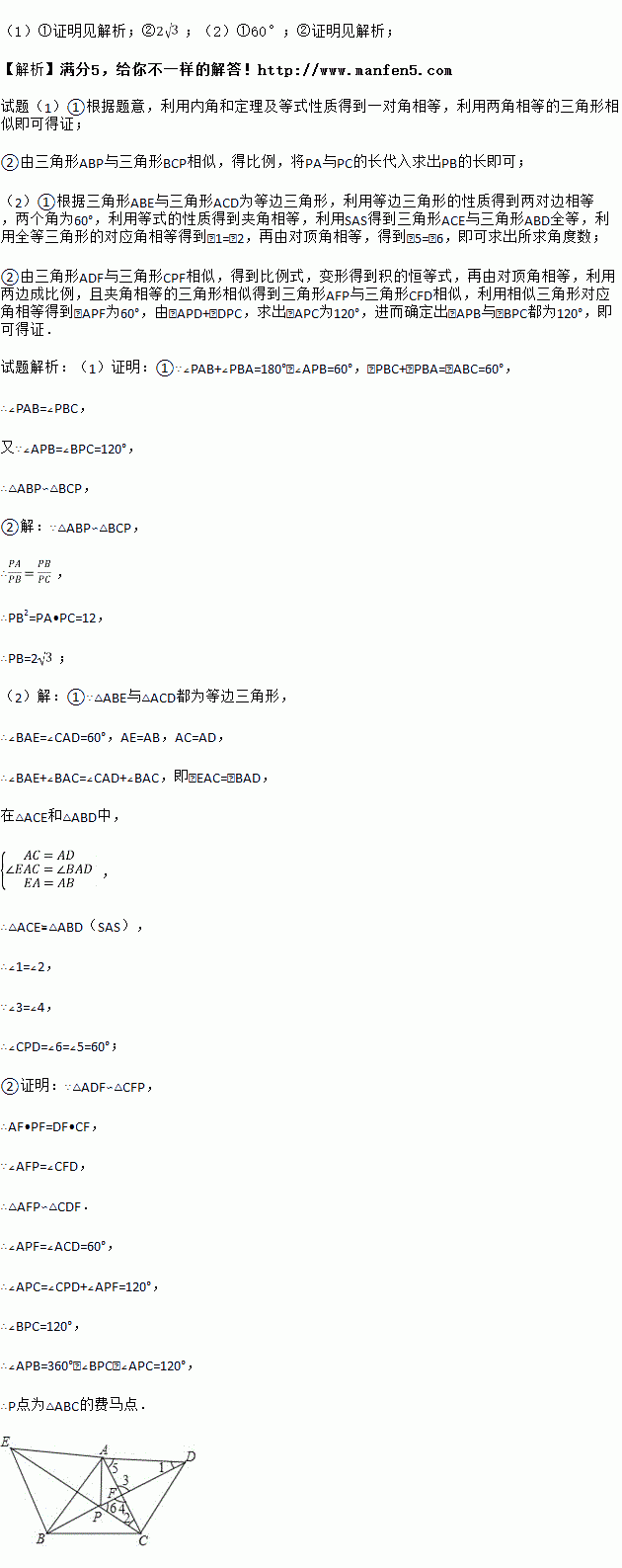 (1)如果点 P 为锐角△ABC 的费马点,且∠ABC=60°.