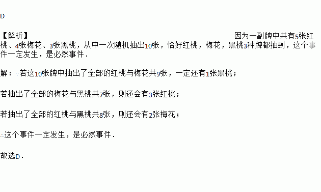 D 【解析】因为一副牌中共有5张红桃、4张梅花、3张黑桃,从中一次随机抽出10张,恰好红桃,梅花,黑桃3种牌都抽到,这个事件一定发生,是必然事件. 【解析】 ∵若这10张牌中抽出了全部的红桃与梅花共9张,一定还有1张黑桃; 若抽出了全部的梅花与黑桃共7张,则还会有3张红桃; 若抽出了全部的红桃与黑桃共8张,则还会有2张梅花; ∴这个事件一定发生,是必然事件. ...