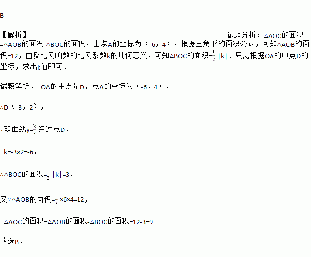 B 【解析】试题分析:△AOC的面积=△AOB的面积-△BOC的面积,由点A的坐标为(-6,4),根据三角形的面积公式,可知△AOB的面积=12,由反比例函数的比例系数k的几何意义,可知△BOC的面积=|k|.只需根据OA的中点D的坐标,求出k值即可. 试题解析:∵OA的中点是D,点A的坐标为(-6,4), ∴D(-3,2), ∵双曲线y=经过点D, ∴k=-3×2=...