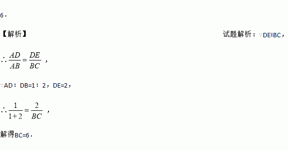 如图,在△ABC中,DE∥BC,AD:DB=1:2,DE=2,则BC的长是 .
