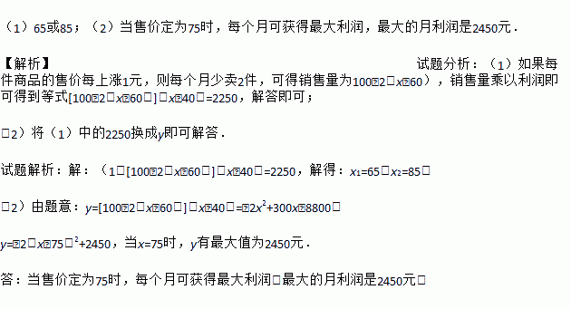 (1)65或85;(2)当售价定为75时,每个月可获得最大利润,最大的月利润是2450元. 【解析】试题分析:(1)如果每件商品的售价每上涨1元,则每个月少卖2件,可得销售量为100﹣2(x﹣60),销售量乘以利润即可得到等式[100﹣2(x﹣60)](x﹣40)=2250,解答即可; (2)将(1)中的2250换成y即可解答. 试题解析:【解析】 (1)[100﹣2(x﹣60...
