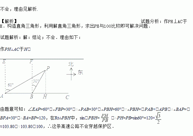 如图所示,C城市在A城市正东方向,现计划在A,C两城市间修建一条高速铁路(即线段AC),经测量,森林保护区的中心P在城市A的北偏东60°方向上,在线段AC上距A城市120 km的B处测得P在北偏东30°方向上,已知森林保护区是以点P为圆心,100 km为半径的圆形区域,请问计划修建的这条高速铁路是否穿越保护区,为什么?(参考数据: