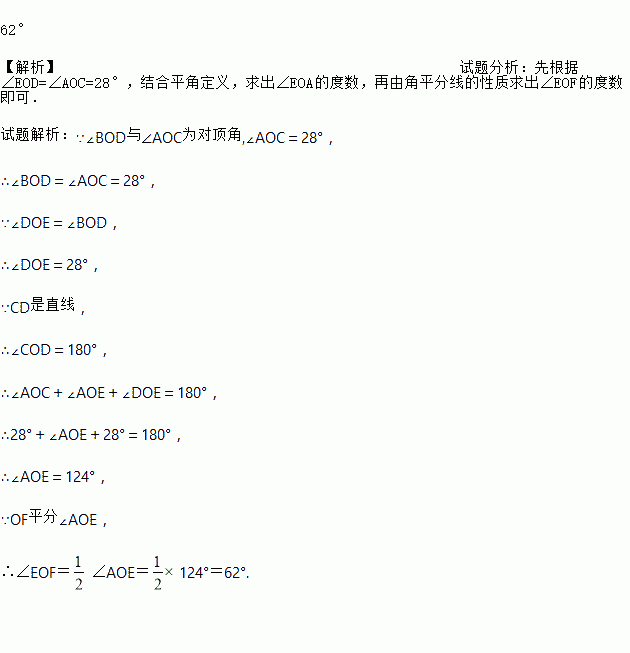 如图所示,直线AB、CD相交于点O,∠DOE=∠BOD,OF平分∠AOE,若∠AOC=28°,求∠EOF的度数.