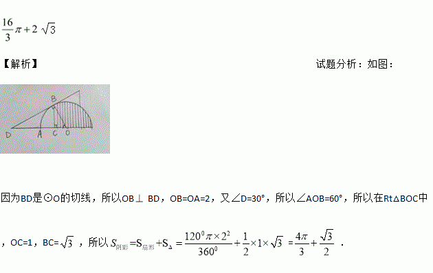 如图,将一块含30°角的直角三角版和半圆量角器按如图的方式摆放 ,使斜边与半圆相切.若半径OA=4,则图中阴影部分的面积为____________.(结果保留π)