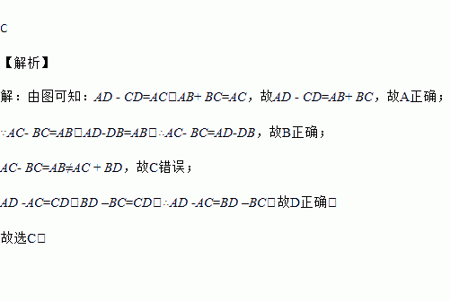 A. AD﹣CD=AB+BC B. AC﹣BC=AD﹣BD