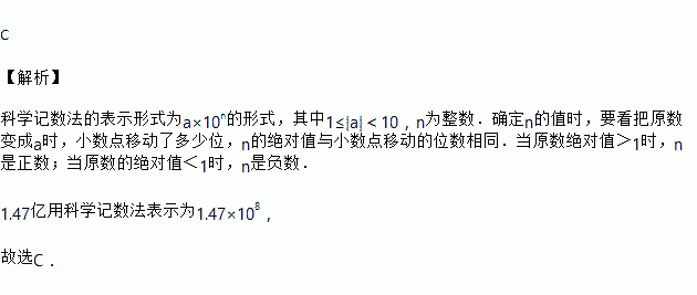 经中国旅游研究院综合测算,今年“五一”假日期间全国接待国内游客1.47亿人次,1.47亿用科学记数法表示为( )
