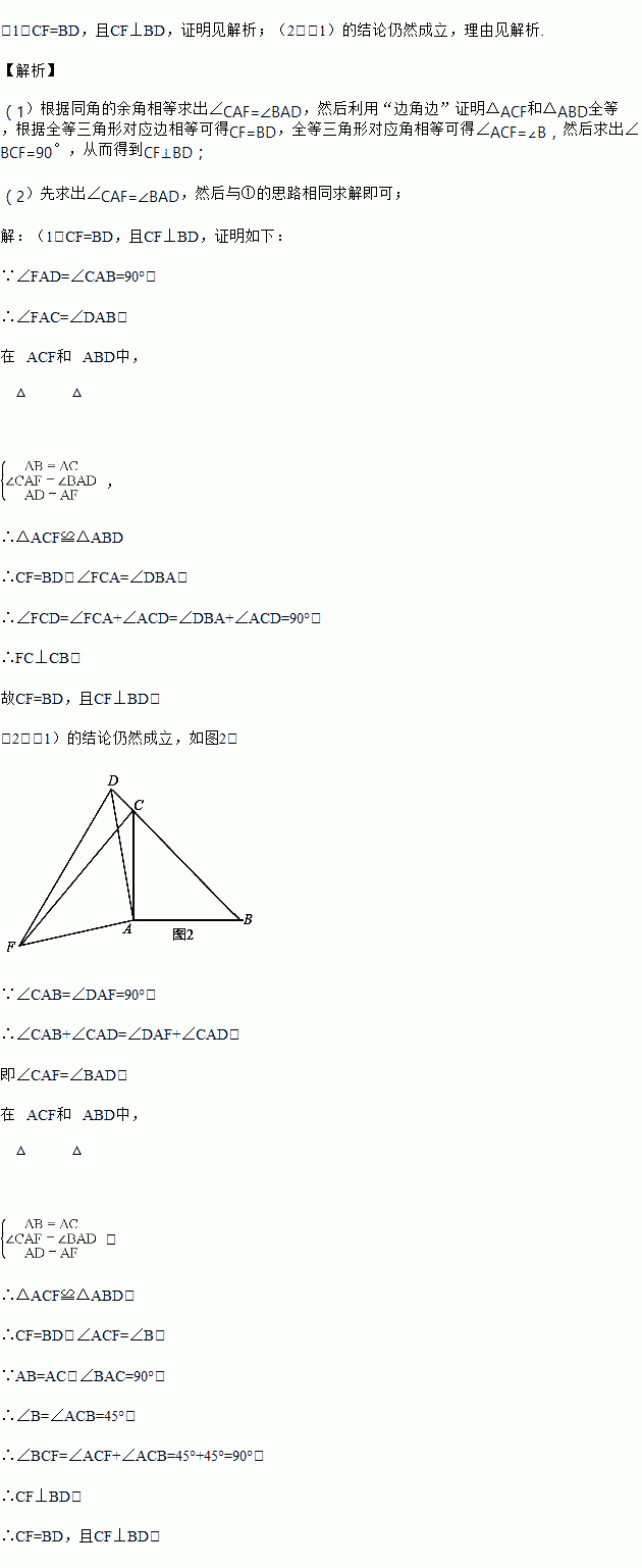 (2)当点D在线段BC的延长线上时,(1)的结论是否仍然成立?请在图2中画出相应的图形,并说明理由.
