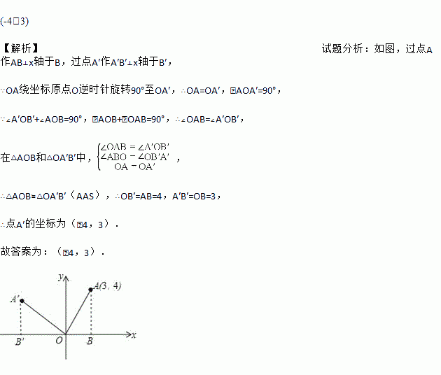 如图所示,在平面直角坐标系xOy中,已知点A(3,4),将OA绕坐标原点O逆时针旋转90°至OA',则点A'的坐标是 .