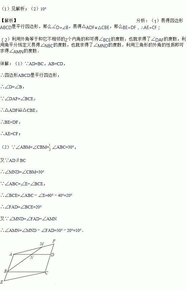 (2)若将此题中的条件改为:“E,F分别是AB,CD延长线上的点”,其余条件不变,此时,∠ABC=60°,∠BEC=40°,作∠ABC的平分线BN交AF于M,交AD于N,求∠AMN的度数(要求:画示意图,不写画法,写推理过程)