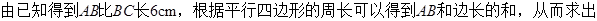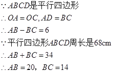 在平行四边形 ABCD中,对角线AC,BD交于O点,其周长为68cm,△AOB的周长比△BOC 的周长多6cm,则AB= cm,BC= cm.