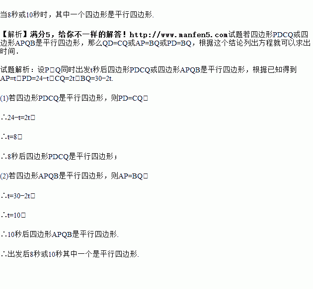 已知:如图,在梯形ABCD中,AD∥BC,AD=24cm,BC=30cm,点P自点A向D以1cm/s的速度运动,到D点即停止.点Q自点C向B以2cm/s的速度运动,到B点即停止,直线PQ截梯形为两个四边形.问当P,Q同时出发,几秒时其中一个四边形为平行四边形?