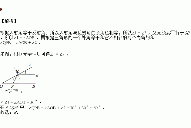 如图,的两边OA,OB均为平面镜,若平行于OB的光线经点Q反射到P,则