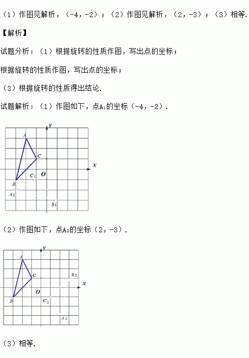 (1)作图见解析,(-4,-2);(2)作图见解析,(2,-3);(3)相等. 【解析】 试题分析:(1)根据旋转的性质作图,写出点的坐标; 根据旋转的性质作图,写出点的坐标; (3)根据旋转的性质得出结论. 试题解析:(1)作图如下,点A1的坐标(-4,-2). (2)作图如下,点A2的坐标(2,-3). (3)相等.