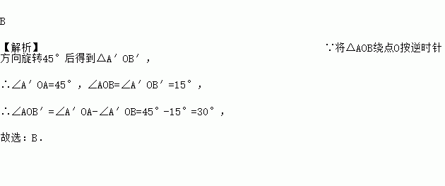 如图,将△AOB绕点O按逆时针方向旋转45°后得到△A'OB',若∠AOB=15°,则∠AOB'的度数是( )