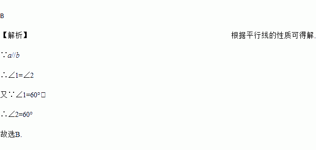 如图,直线a,b被直线c所截,a//b,∠1=60°,则∠2的度数是( )