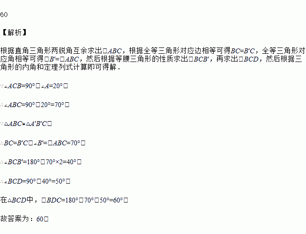 如图,中,,,≌,若恰好经过点B,交AB于D,则的度数为______