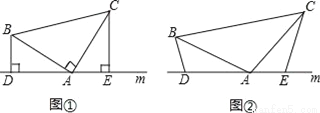 (1)已知,如图①,在△ABC中,∠BAC=90°,AB=AC,直线m经过点A,BD⊥直线m,CE⊥直线m,垂足分别为点D、E,求证:DE=BD+CE.