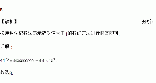 2017年5月,“一带一路”论坛峰会在北京隆重召开,促进了我国与世界各国的互联互通互惠,“一带一路”地区覆盖总人数约为44亿人,44亿这个数用科学记数法表示( )