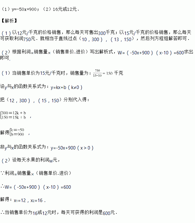 (2)当销售单价为何值时,该超市销售这种水果每天获得的利润达600元?