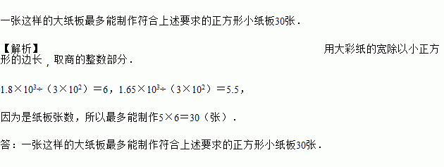 某班同学用一张长为1.8×103 mm,宽为1.65×103 mm的大彩色纸板制作一些边长为3×102 mm的正方形小纸板写标题(不能拼接).请计算一张这样的大纸板最多能制作符合上述要求的正方形小纸板多少张.
