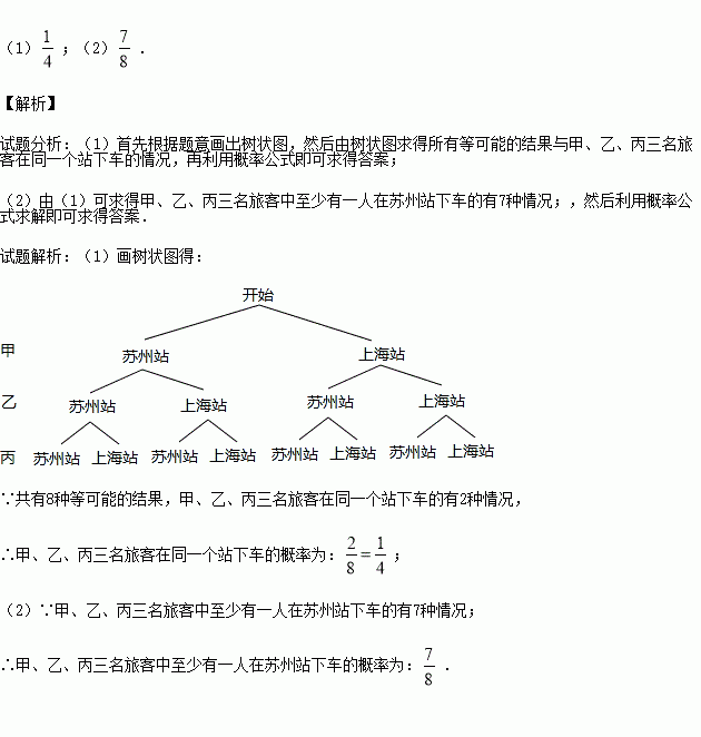 (2)求甲、乙、丙三名旅客中至少有一人在苏州站下车的概率.