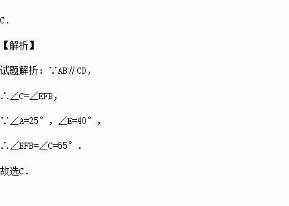 如图,已知AB∥CD,若∠A=25°,∠E=40°,则∠C的大小是( )