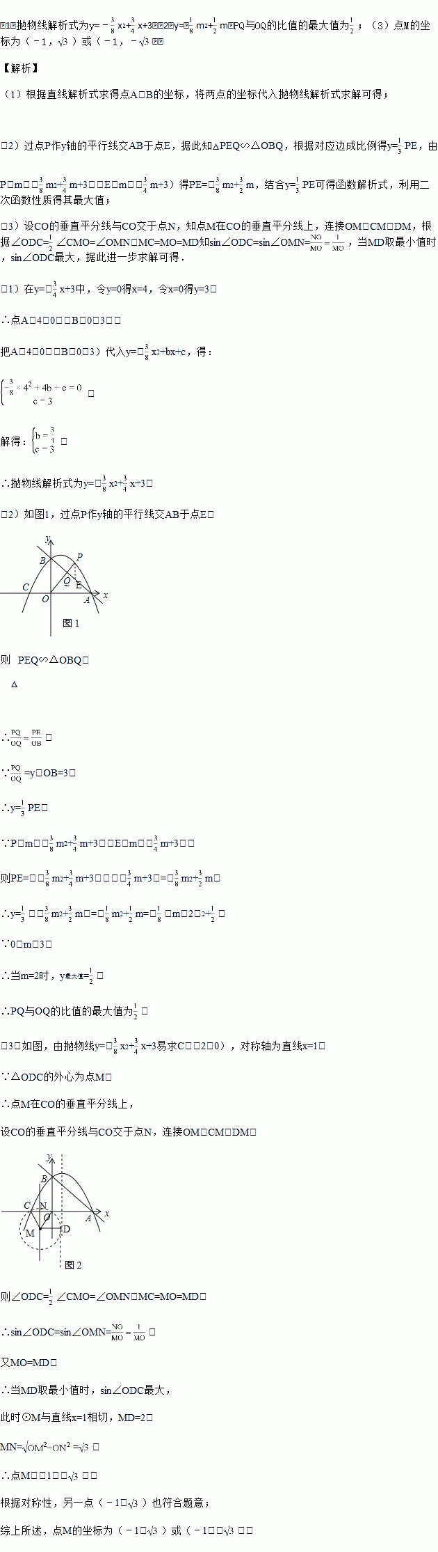 (3)点D是抛物线对称轴上的一动点,连接OD、CD,设△ODC外接圆的圆心为M,当sin∠ODC的值最大时,求点M的坐标.