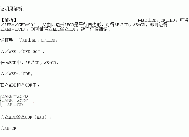 如图,平行四边形ABCD中,AE⊥BD于点E,CF⊥BD于点F.