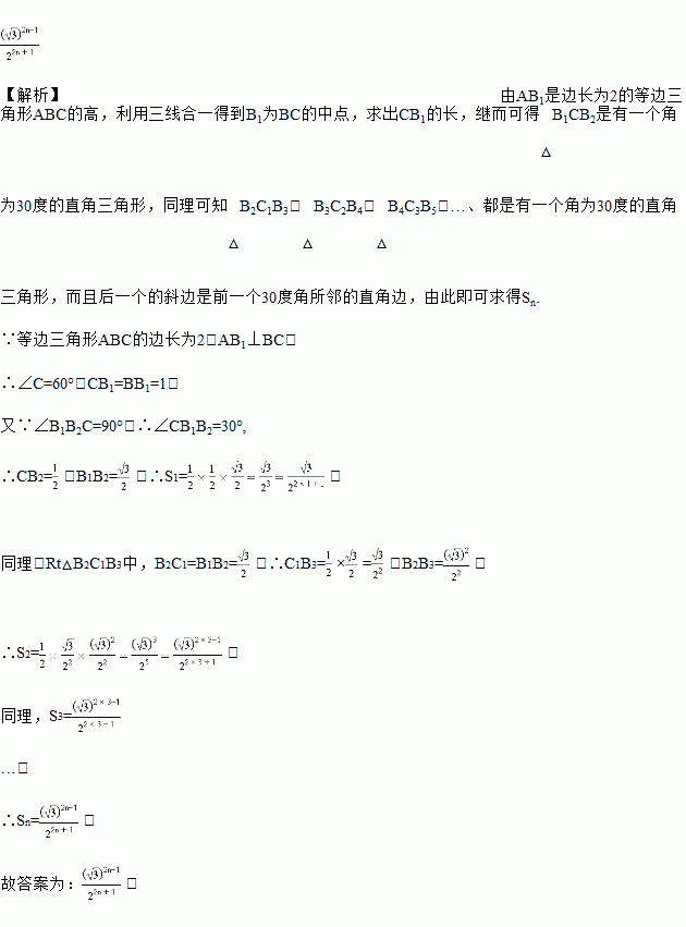 如图,已知等边△ABC的边长是2,以BC边上的高AB1为边作等边三角形,得到第一个等边△AB1C1;再以等边△AB1C1的B1C1边上的高AB2为边作等边三角形,得到第二个等边△AB2C2;再以等边△AB2C2的B2C2边上的高AB3为边作等边三角形,得到第三个等边△AB3C3;…,记△B1CB2的面积为S1,△B2C1B3的面积为S2,△B3C2B4的面积为S3,如此下去,则Sn=_____.