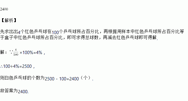 一个盒子中装有白色的乒乓球、为估计这袋里有多少个乒乓球,小李将形状,大小都相同的红色乒乓球个混入其中,摇匀后任意取出粒,发现红色乒乓球有个,则可估计出白色乒乓球有个数为________个.