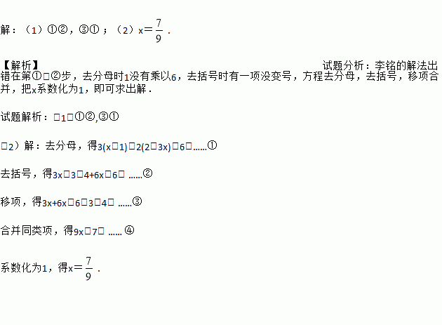 【解析】 (1)①②,③① ;(2)x=. 【解析】试题分析:李铭的解法出错在第①、②步,去分母时1没有乘以6,去括号时有一项没变号,方程去分母,去括号,移项合并,把x系数化为1,即可求出解. 试题解析:(1)①②,③① (2)【解析】 去分母,得3(x+1)-2(2-3x)=6;……① 去括号,得3x+3-4+6x=6; ……② 移项,得3x+6x=6-3+4;...
