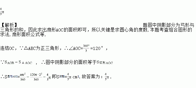 如图,等边三角形ABC内接于⊙O,若⊙O的半径为2,则图中阴影部分的面积等于_______.
