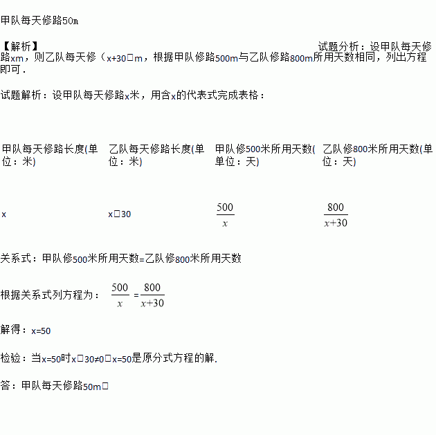 甲队每天修路50m 【解析】试题分析:设甲队每天修路xm,则乙队每天修(x+30)m,根据甲队修路500m与乙队修路800m所用天数相同,列出方程即可. 试题解析:设甲队每天修路x米,用含x的代表式完成表格: 甲队每天修路长度(单位:米) 乙队每天修路长度(单位:米) 甲队修500米所用天数(单位:天) 乙队修800米所用天数(单位:天) x x+3...