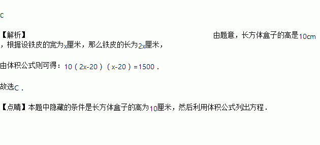 把一块长与宽之比为2∶1的铁皮的四角各剪去一个边长为10 cm的小正方形,折起四边,可以做成一个无盖的盒子.如果这个盒子的容积是1 500 cm3,那么铁皮的长和宽各是多少?若设铁皮的宽为x cm,则正确的方程是( )