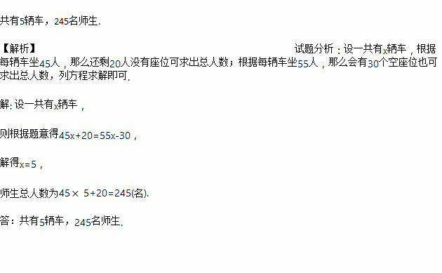 某校组师生春游活动,如果每辆车坐45人,那么还剩20人没有座位;如果每辆车坐55人,那么会有30个空座位.共有几辆车?有多少名师生?