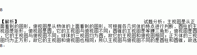 B 【解析】试题分析:主视图是从正面看到的图形,俯视图是从物体的上面看到的图形,可根据各几何体的特点进行判断.圆柱的主视图是矩形,俯视图是圆,它的主视图与俯视图不同;圆锥的主视图是等腰三角形,俯视图是圆,它的主视图与俯视图不同;球体的三视图均为圆,故它的主视图和俯视图相同;正方体的三视图均为正方形,故它的主视图和俯视图也相同;所以主视图与俯视图不同的是圆柱和圆锥,故选B.