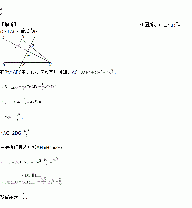 如图,在直角梯形ABCD中,AD∥BC,∠B=90°,AD=3,AB=4,BC=8,点E、F分别在边CD、BC上,联结EF.如果△CEF沿直线EF翻折,点C与点A恰好重合,那么的值是_____.