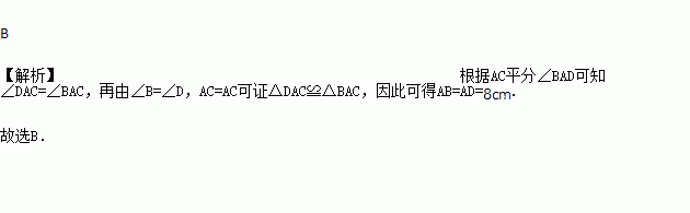 如图,AC平分∠BAD, ∠B=∠D ,AB=8㎝,则AD=( )