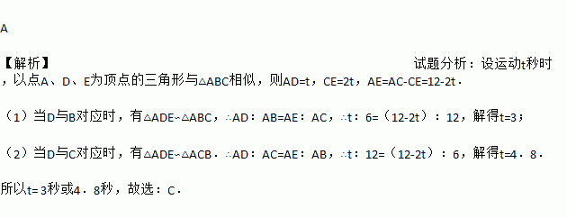 如图,在钝角三角形ABC中,AB=6cm,AC=12cm,动点D从A点出发到B点止,动点E从C点出发到A点止.点D运动的速度为1cm/秒,点E运动的速度为2cm/秒.如果两点同时运动,那么当以点A、D、E为顶点的三角形与△ABC相似时,运动的时间是( )
