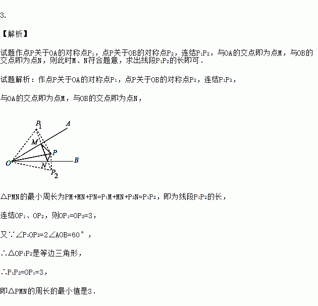如图,已知∠AOB=30°,P为其内部一点,OP=3,M、N分别为OA、OB边上的一点,要使△PMN的周长最小,请给出确定点M、N位置的方法,并求出最小周长.