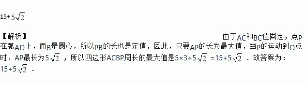 如图,弧AD是以等边三角形ABC一边AB为半径的四分之一圆周, P为弧AD上任意一点,若AC=5,则四边形ACBP周长的最大值是
