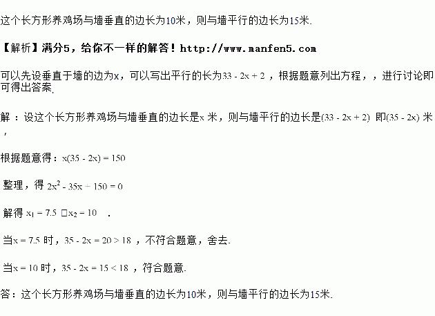 如图,现有一个面积为150平方米的长方形养鸡场,鸡场的一边靠墙(墙长18米),另三边用竹篱笆围成,在与墙平行的一边,开一扇2米宽的门.如果竹篱笆的长为33米,求这个长方形养鸡场与墙垂直的边长是多少?与墙平行的边长是多少?(列方程解答)