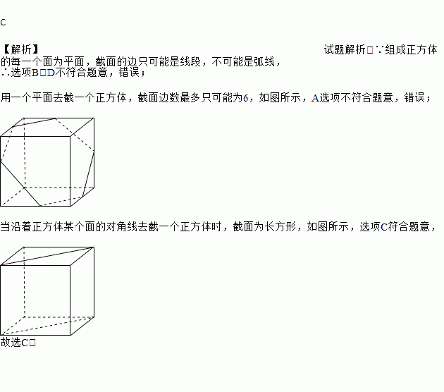 C 【解析】试题解析:∵组成正方体的每一个面为平面,截面的边只可能是线段,不可能是弧线, ∴选项B、D不符合题意,错误; 用一个平面去截一个正方体,截面边数最多只可能为6,如图所示,A选项不符合题意,错误; 当沿着正方体某个面的对角线去截一个正方体时,截面为长方形,如图所示,选项C符合题意, 故选C.