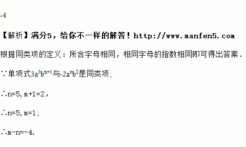 若单项式3a5bm+1与-2anb2是同类项,则m-n=__________.