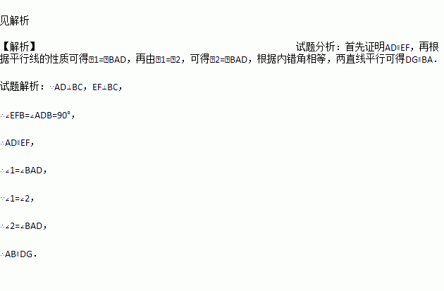 (9分)已知:如图,AD⊥BC,EF⊥BC ,∠1=∠2.求证:DG∥AB.