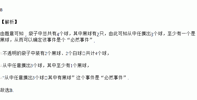 一只不透明的袋子中装有2个黑球、2个白球,每个球除颜色外都相同.将球摇匀,从中任意摸出3个球,其中有黑球,这个事件是( )